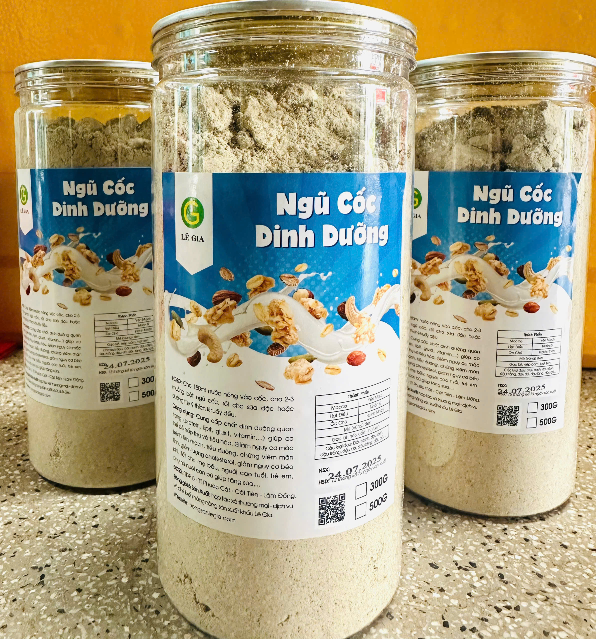 Bột ngũ cốc Lê Gia từ 22 loại hạt: đậu xanh, đậu đen, đậu đỏ, đậu trắng, đậu gà, đậu lăng, mè, hạnh nhân, óc chó, macca, bí xanh, óc chó đỏ, gạo lứt, hạt sen, hạt điều, yến mạch, nếp cẩm, hạt lanh, đậu ngự, gạo lứt; mè đen, óc chó vàng. Là 22 loại hạt mang giá trị dinh dưỡng cao, qua quy trình chọn lọc tỉ mỉ hình thành sản phẩm bột ngũ cốc chất lượng nhất đến tay người tiêu dùng.