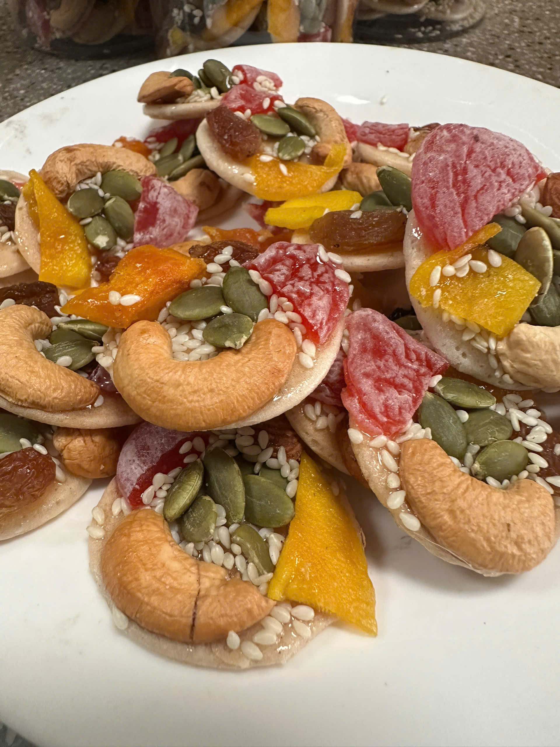 Nho khô, xoài sấy dẻo, đào sấy dẻo: bổ sung vị ngọt trái cây tự nhiên, giàu chất xơ và vitamin.